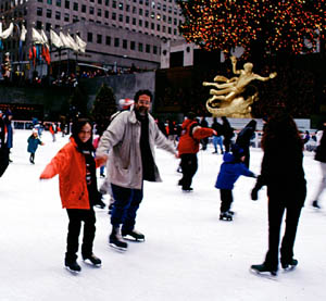 Today we went in to Manhattan. We took the Long Island Railroad. There's a ticket machine outside the Lawrence station, rather than a human being. I always seem to have the wrong bills and/or change for it. As always, we had to change trains at Jamaica before reaching Penn Station. Then it we took the subway uptown, and began walking. As a former Manhattanite, Jane is in her element in the subway. I know I'd take at least twice as long to get anywhere. The kids and I skated on the ice at Rockefeller Center. I shot an entire roll of film of the kids on the ice with some of the famous statues and the Christmas tree in the background. Jane watched, guarded our shoes, and took a couple of shots of Logan and me skating together.