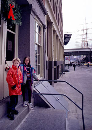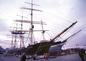 It had gotten rather chilly, and Jane couldn't stay outdoors any more. So Logan joined Jane and Channing visiting shops, while Rev and I toured two sailing ships that were being restored. These were among the last sail cargo shops made, iron hulled, and quite big. Our guide explained that sail had remained economically viable for certain routes and cargoes up into the 1930s, though the depression idled most of the ships. He pointed out the high sills on the doorways - perhaps a foot or more high. These prevented water from rushing into the cabin areas when there was water on the deck. Under full load the main deck was not very far above sea level, and water frequently came on board. The woodwork was very beautiful, exquisitely made of teak, mahogany, and other fine woods, with care and attention to detail that would never be lavished on a piece of industrial equipment today.