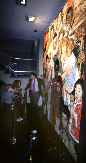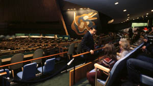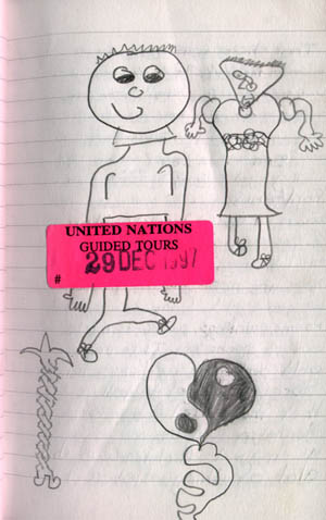 That sticker was my key to the tour in the U.N. The U.N. stands for United Nations. The United Nations is a corporation that people from all around the world work in. The United Nations is not a part of America. Let me give you some history on it. The United Nations was first started in San Francisco. This building was made because of the war called World War 2. Because they wanted a building to talk things over so they won't have any more wars. On the tour we saw a lot of things. We saw rooms, paintings, pictures made out of rock, etc. It is very cold outside and it is raining. Sorry I forgot to tell you that the United Nations is in Manhattan, and we had to take a train to Manhattan.